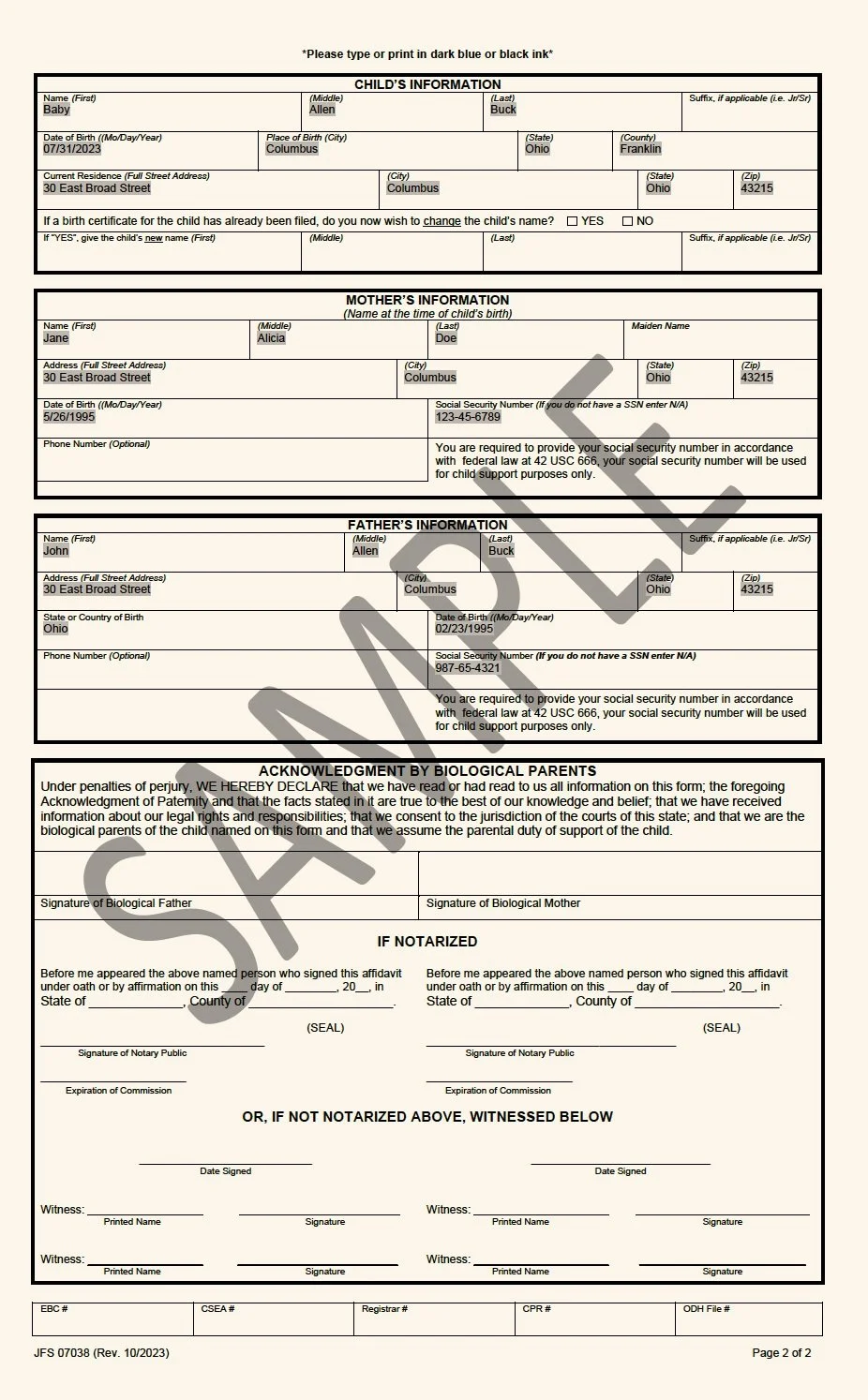 If unmarried, and both parties agree they are the biological parents of the child, the "Acknowledgment of Paternity Affidavit” (JFS 07038) can be completed. By signing the form, parents are establishing paternity for their child - meaning legally recognized fatherhood. Completing this form is voluntary, it’s free, and is the quickest way to establish paternity. Once completed, the Acknowledgement of Paternity Affidavit is used to add the biological father to the child’s birth certificate.